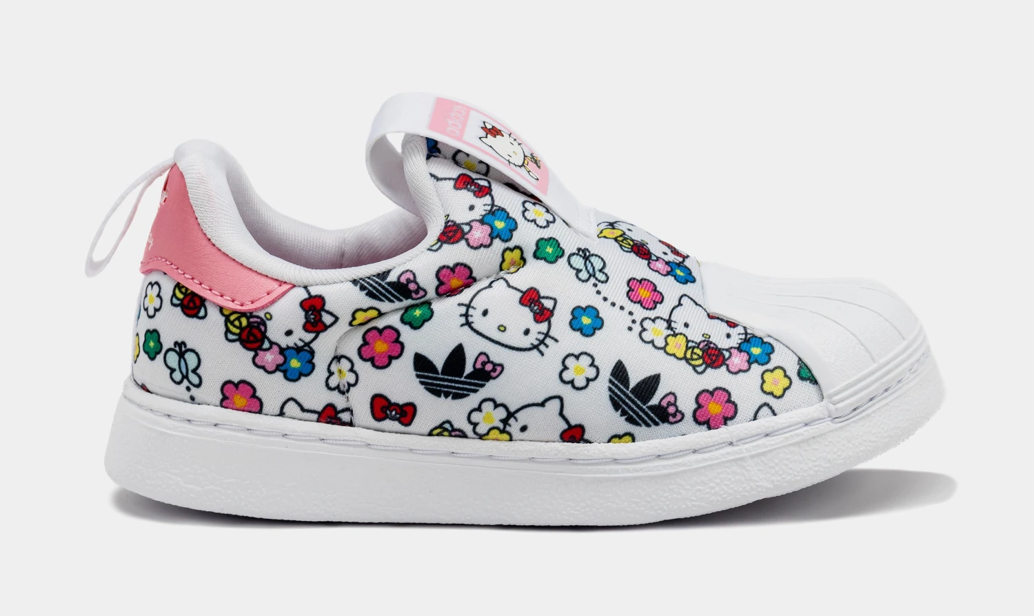Two icons come together with these adidas Superstar shoes. Technically three icons, if you count the one who is lacing into them. This toddlers’ version of the iconic rubber-shell-toe shoes brings in some (OK, a lot of) Hello Kitty inspiration for a celebration of friendship.