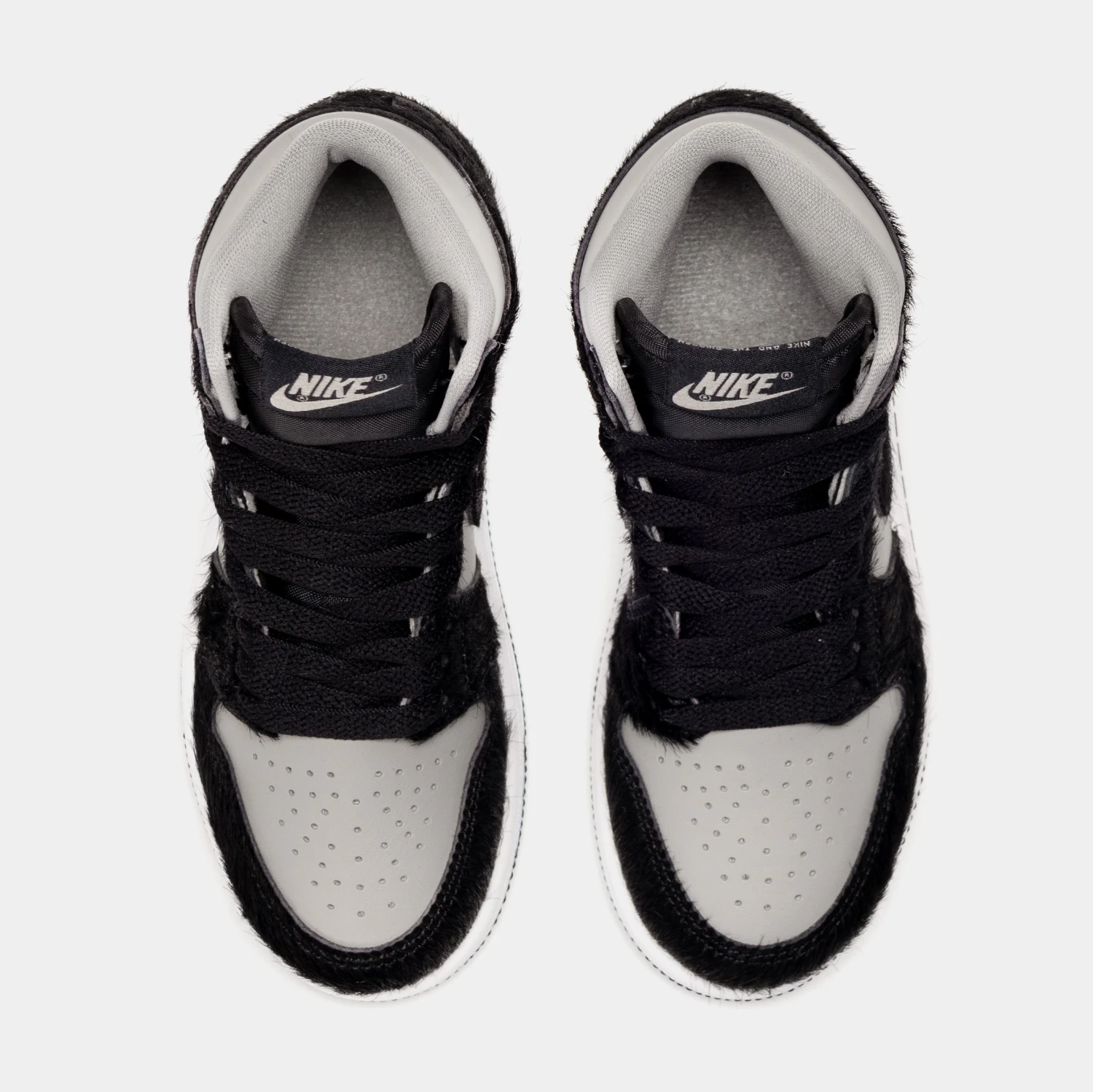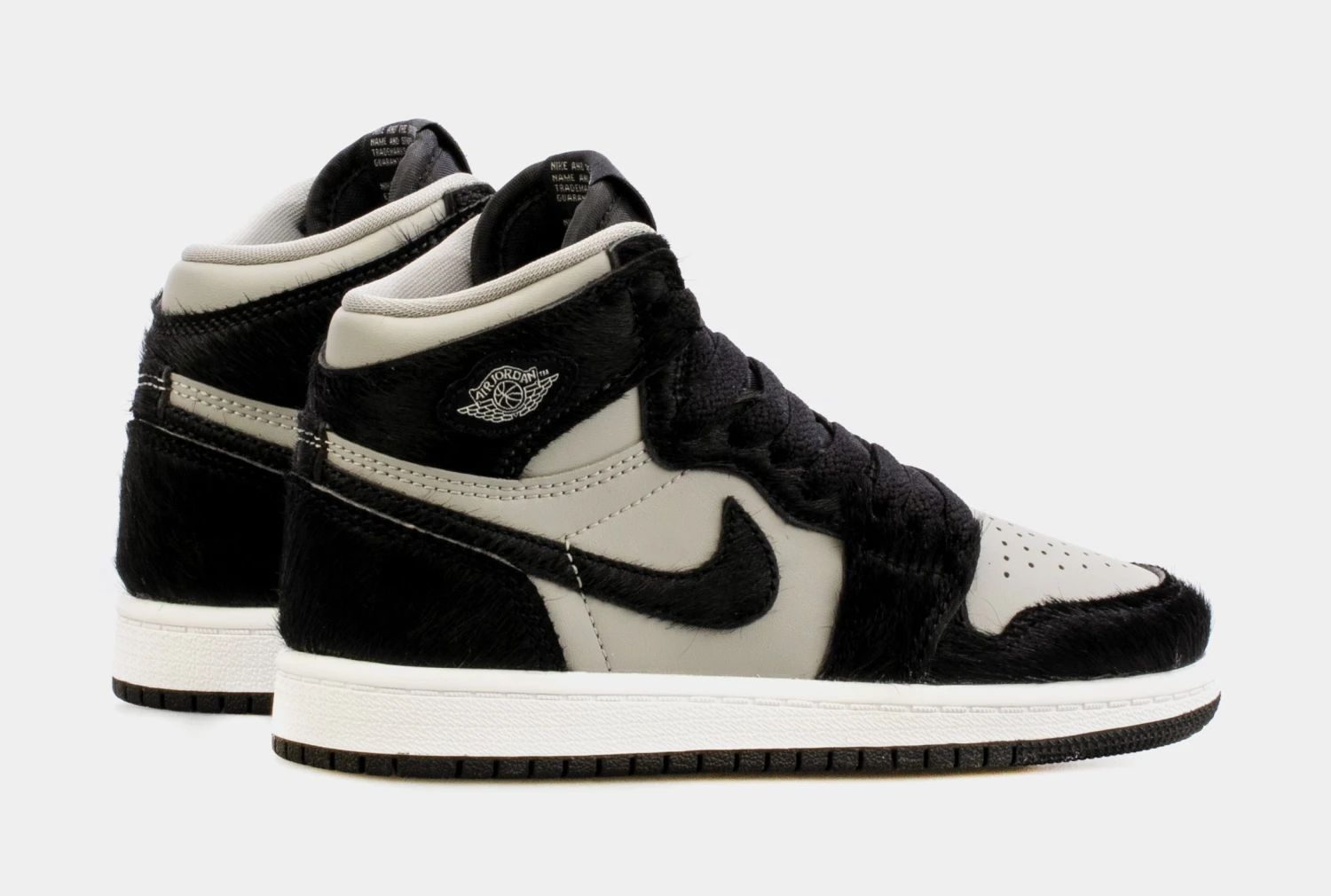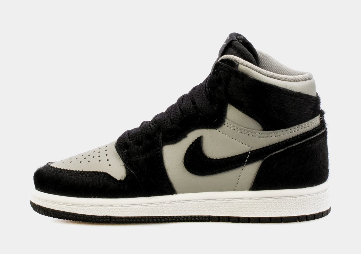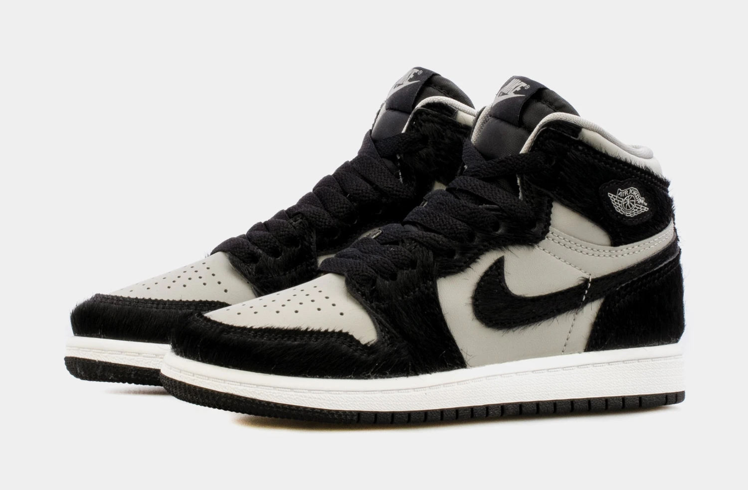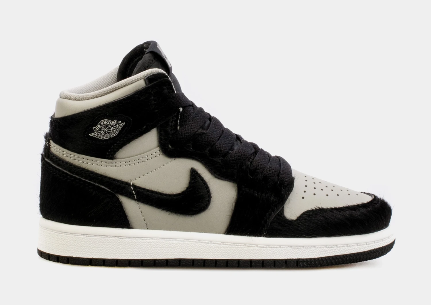Dressed in a Medium Grey, Black, and White color scheme. This offering of the Air Jordan 1 features a Light Grey leather upper with Black pony hair overlays and Swooshes. A metal Wings logos on the lateral ankle atop a White midsole and Black rubber outsole completes the design.