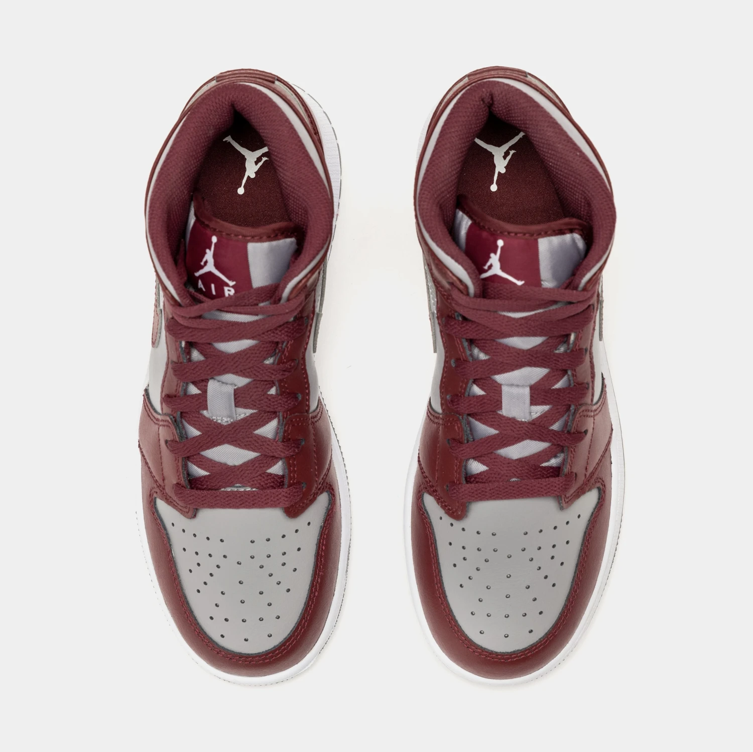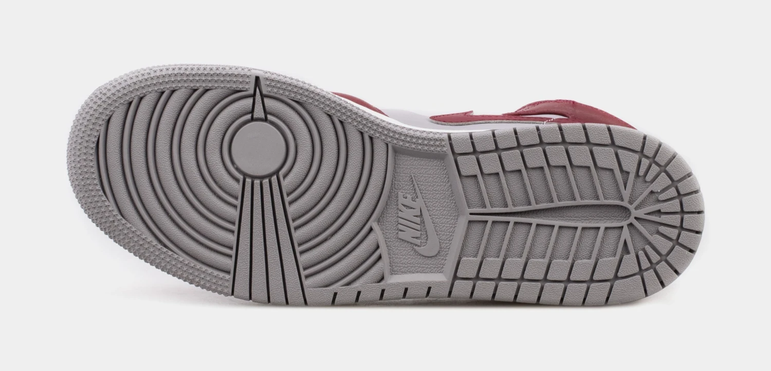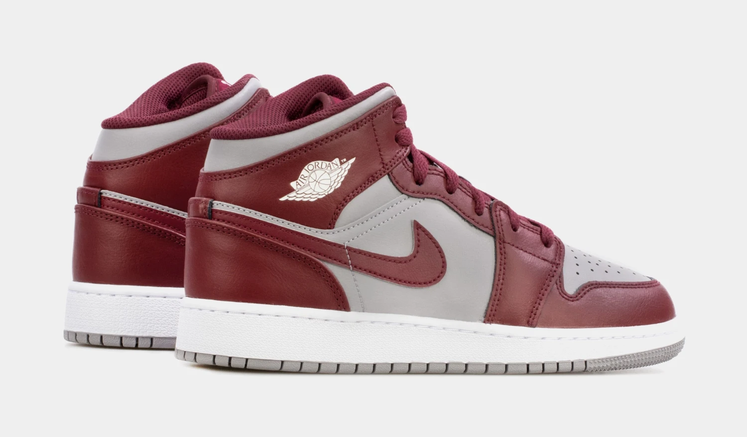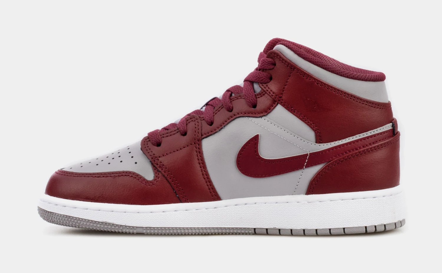 Dressed in a Cherrywood Red, White, and Cement Grey color scheme. This offering of the mid-top Air Jordan 1 comes constructed in full leather build with mesh tongues and lining featuring a Grey base with Dark Red overlays. A White midsole atop a Grey rubber outsole completes the design