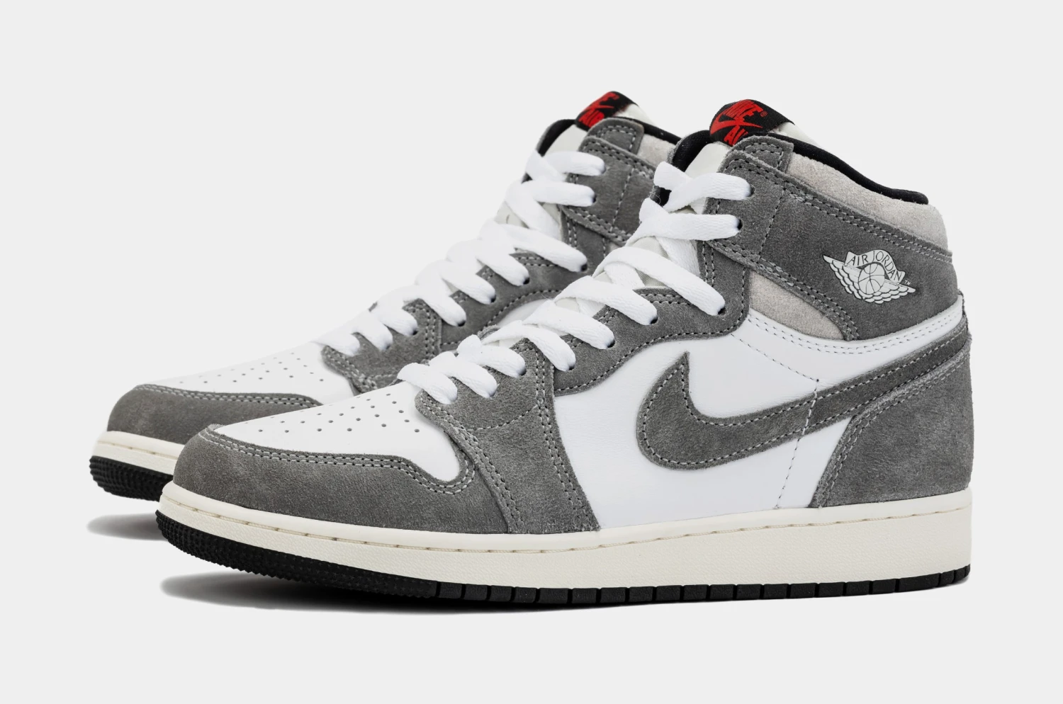 Dressed in a Black, Fire Red, Light Smoke Grey, and Sail color scheme. This offering of the Air Jordan 1 features a White leather base with Grey suede washed overlays, a light shades used on the collars along with Red branded tongue labels. A Sail midsole atop a Black rubber outsole completes the design.