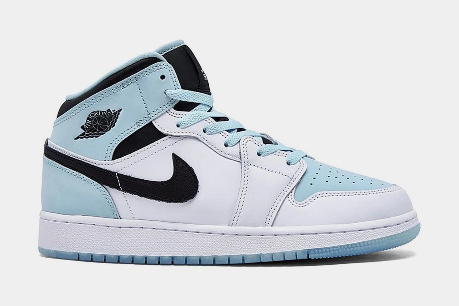 This offering of the mid-top Air Jordan 1 constructed in a full leather base with mesh tongues and lining. It features a White base with Black Swooshes, tongues, and collars highlighted with Light Blue contrasting accents. A White midsole atop an icy translucent outsole completes the design.
