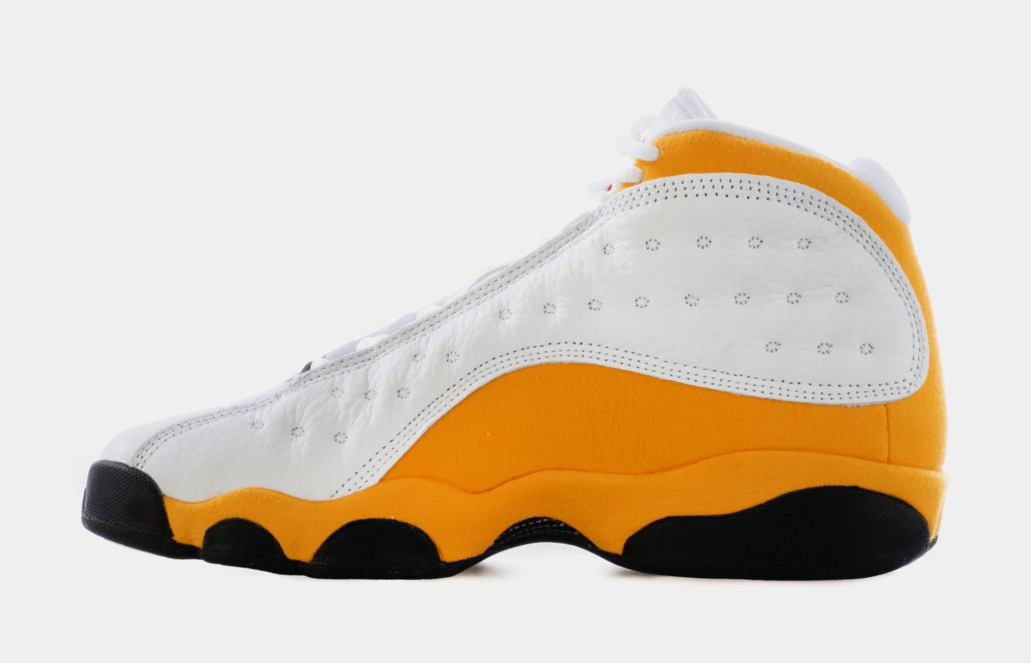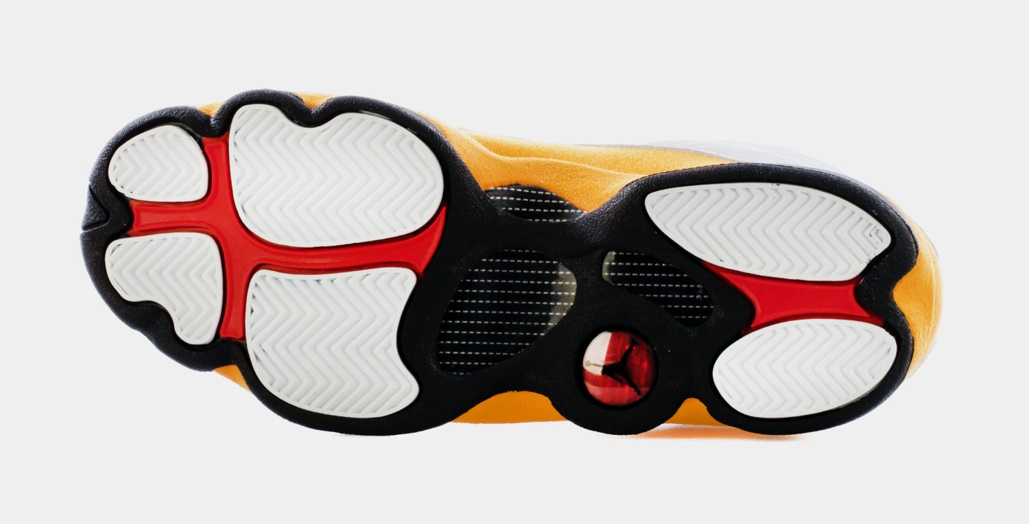 Dressed in a White, University Red, Del Sol, and Black color scheme. This Air Jordan 13 features White leather on the panels, toe, and tongues with a matching liner. Other details include Yellow (Del Sol) suede overlays, Red appearing on the Jumpman tongue and outsole completed with a Black rubber sole. The release will also include OG packaging and available in full family sizing.