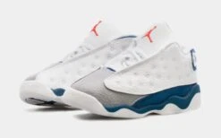 Dressed in a White, Fire Red, French Blue, and Light Steel Grey color scheme nodding to the “True Blue” Air Jordan 3. This offering of the Air Jordan 13 features White covering the leather uppers, tongues, liners, and midsole paired with Grey appearing on the toes and outsole. A Red Jumpman on the tongues with French Blue suede overlays and midsoles completes the design.