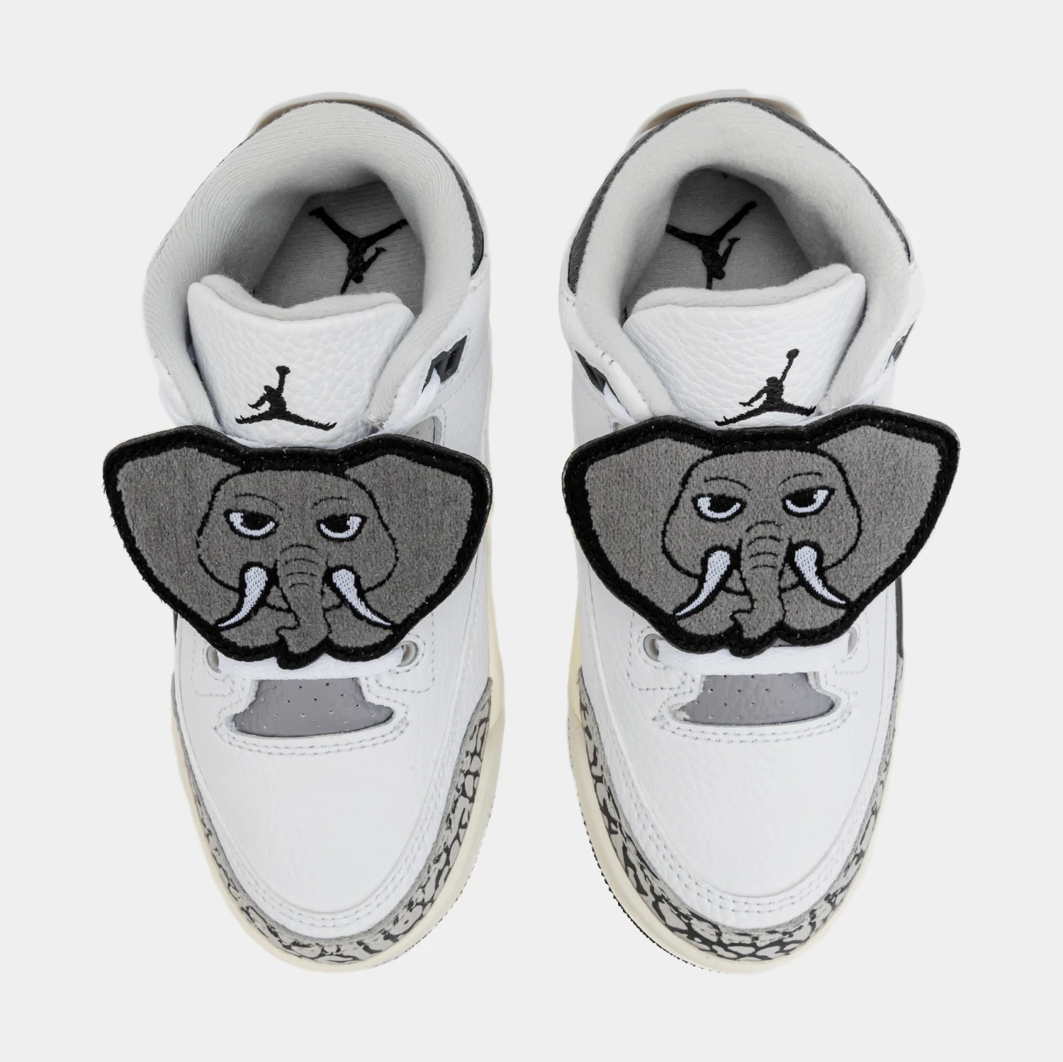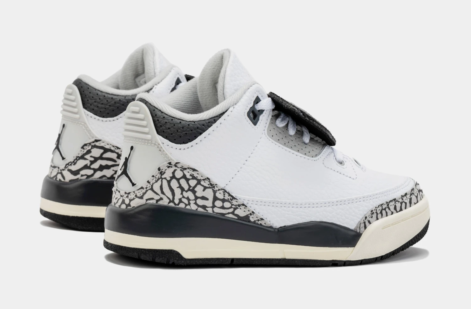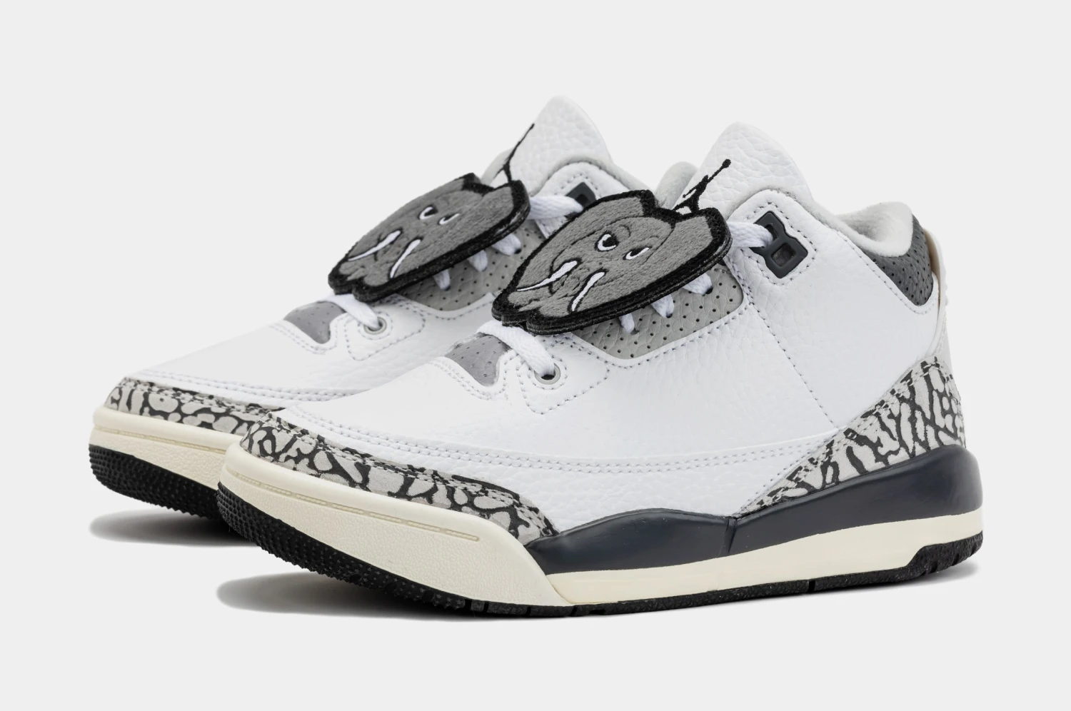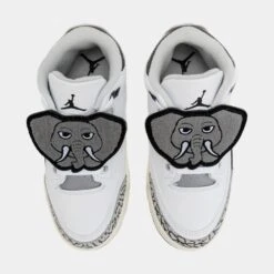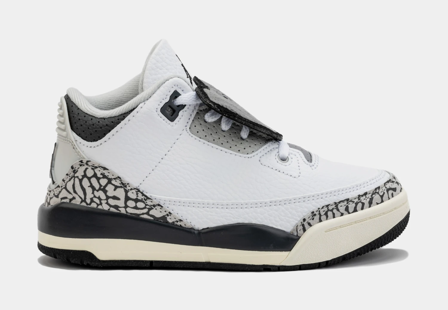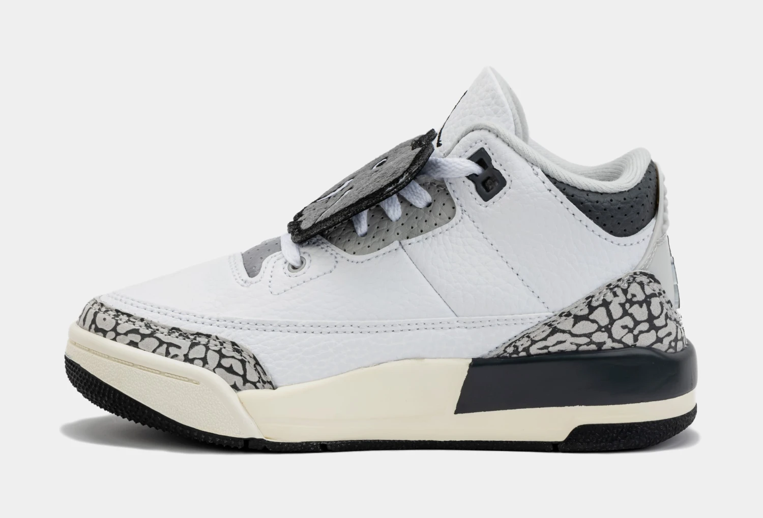Dressed in a White, Black, Iron, Light Ash Grey, Sail, and Cement Grey color scheme. This offering of the Air Jordan 3 features a White leather upper with Grey detailing and signature elephant print overlays. A Sail midsole atop a Black rubber outsole completes the design.