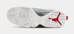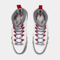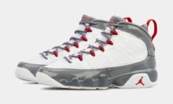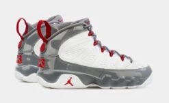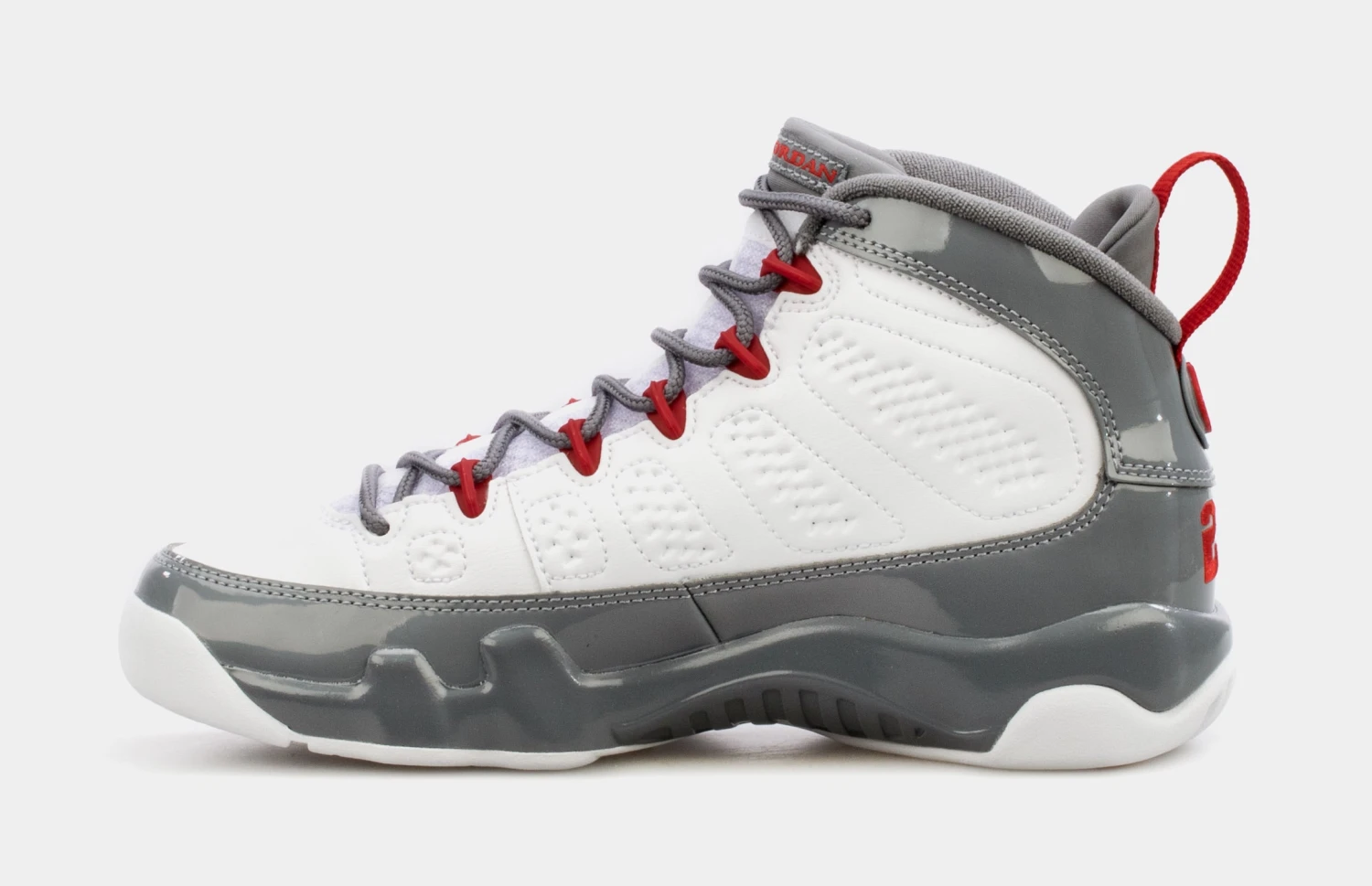 Dressed in a White, Fire Red, and Cool Grey color scheme. This offering of the Air Jordan 9 features a White leather base with Grey patent leather overlays and Red contrasting accents. A glossy Grey midsole atop a White rubber outsole completes the design.